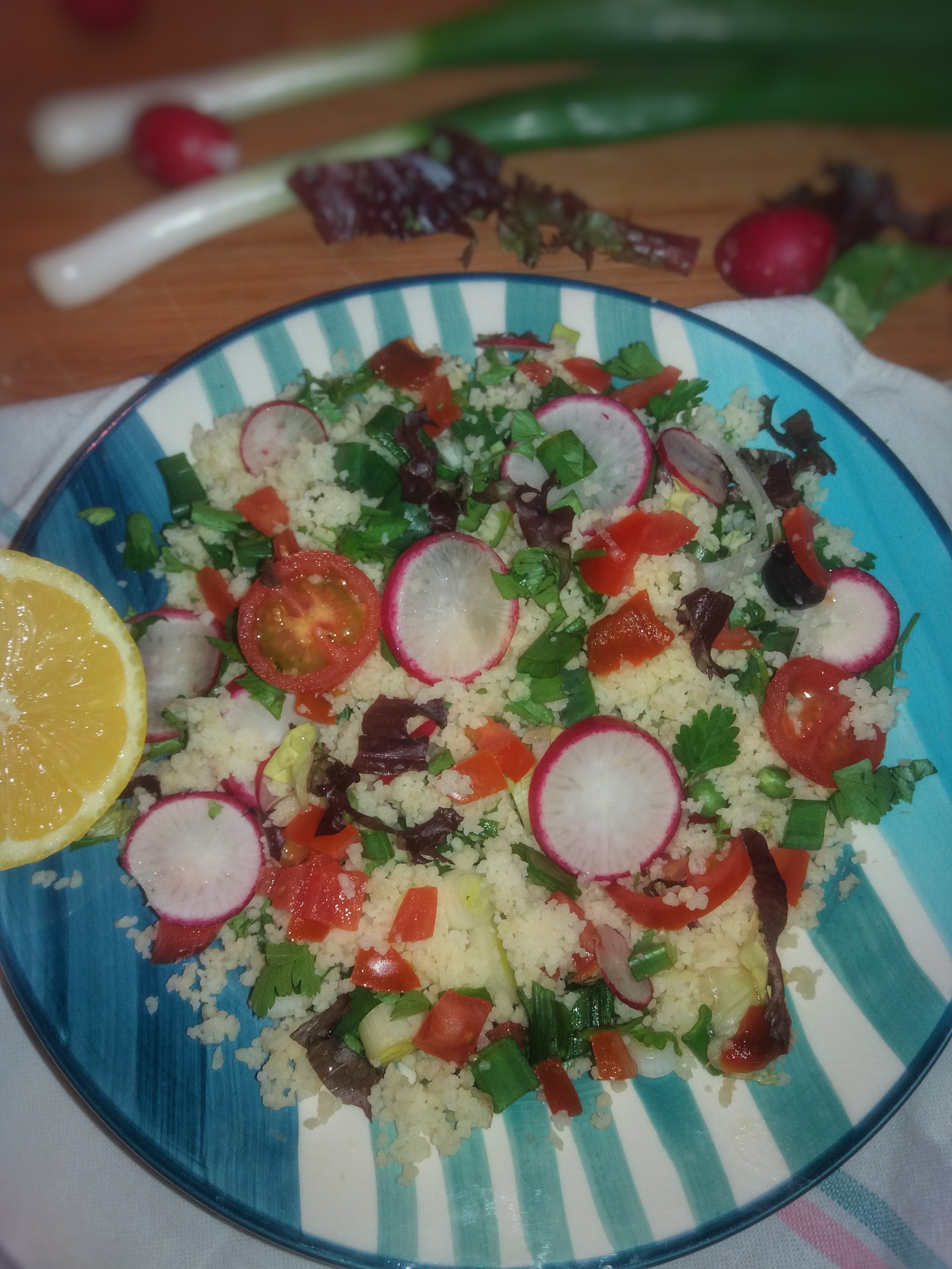 Mod de preparare. Se dă în clocot apa. Se hidratează cușcusul în apă fierbinte 20 min. Se lasă să se răcească. Se feliază legumele (au am făcut și cuburi și rondele pentru un aspect frumos), pătrunjelul se toacă mărunt. Se amestecă legumele cu cușcușul și cu sare și piper după gust. Se stoarce și lămâia, atât cât vă place, dar cred că gustul lămâiei îi dă savoare acestei rețete. Pentru un pic de aromă și textură mai onctuoasă puteți pune și puțin ulei de măsline.