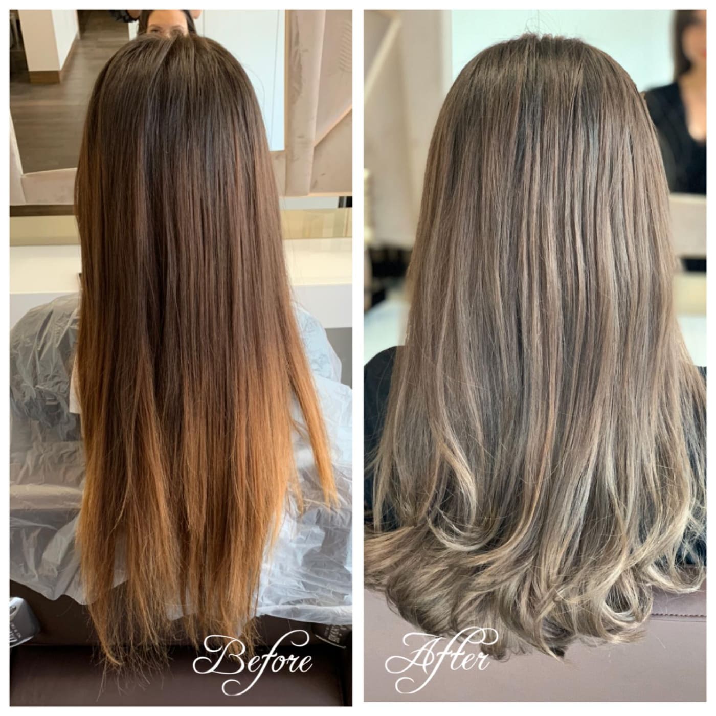 Revenind, părul meu chiar avea nevoie de o revitalizare, după o încercare nefericită de a mă vopsi acasă – “curățat”, tuns, pentru că era destul de damaged pe vârfuri, vopsit și mai știu eu ce… Așa că, după ce l-a analizat și i-am arătat eu câteva fotografii – o mie like –  cum aș vrea să arate părul meu, s-a burzuluit ea un pic la mine pentru că oricum știa mai bine ce să facă și eu nu prea mă hotăram ce vreau, așa că m-am lăsat pe mâinile ei.  Și bine am făcut pentru că nu doar că mi-a ieșit cea mai mișto culoare pe care am avut vreodată, dar mi l-a și salvat. Operațiune destul de meticuloasă cu pași de șuvițare, spălăre, bază la radacină, vopsea pe vârfuri, tratat, uscat, coafat. Poftim, mai jos înainte si după.