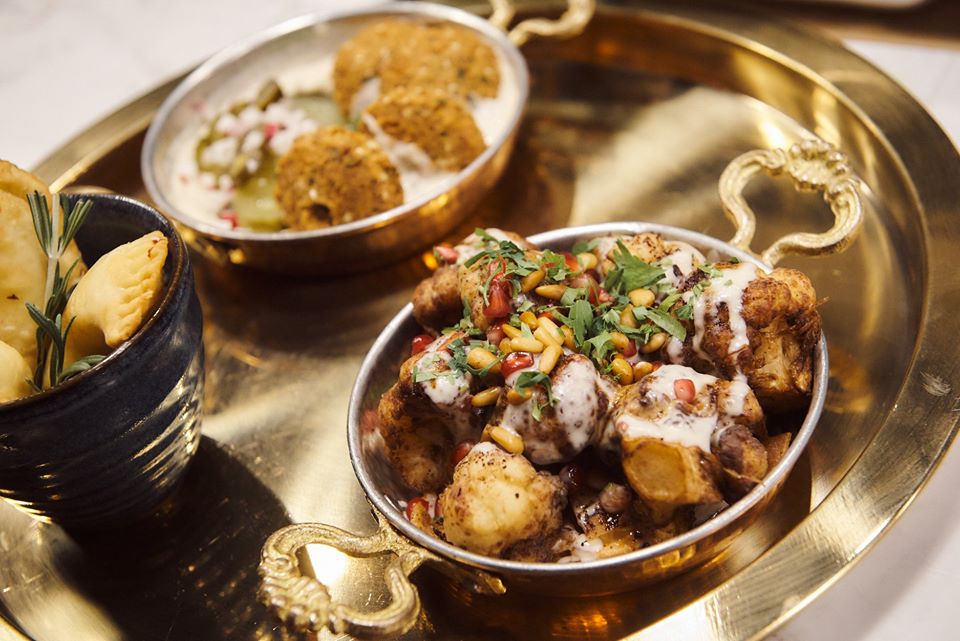 Ce mi-a plăcut mie foarte mult, deși nu am reușit să stau până la finalul opsățului (cred că mai sunt lucruri bune) au fost hummusurile cu salsa de trufe și cu cu avocado, muhammara -pasta de ardei iute, nuci și alune cu ulei de măsline și chimen, un mutabal interesant cu sfeclă, conopida tempura cu sos de rodii, tahini și muguri de pin, shaorma marinată 12 ore într-un mix de condimente al casei și kebab-ul din carne de vițel la jar cu salsa picantă. Diferite combinații de condimente, flori comestibile, sosurile sunt ici și colo aduăgate pentru plusul acesta de nou de care vă spuneam.