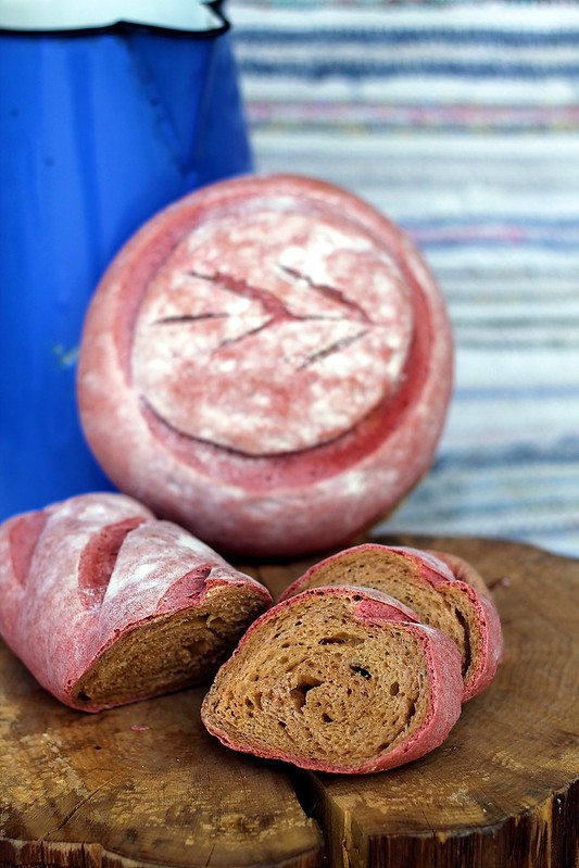 Este o rețetă cu făină, lapte, unt și drojdie a Mihaelei Sava – www.laprajiturela.ro, pe care o găsiți detaliată aici. La ea, veți mai vedea multe alte idei, de la chifle pufoase cu semințe și mac, rapide, fără drojdie și fără frământare, pâine cu bicarbonat, toast cu făină integrală, neagră cu usturoi, precum și revelația cu semințe și nuci, prezentată la Bake Off Romania, și cea din fotografia de mai jos, o inedită pâine cu sfeclă și rozmarin. Plus multe altele, la fel de apetisante. Vedeti aici: