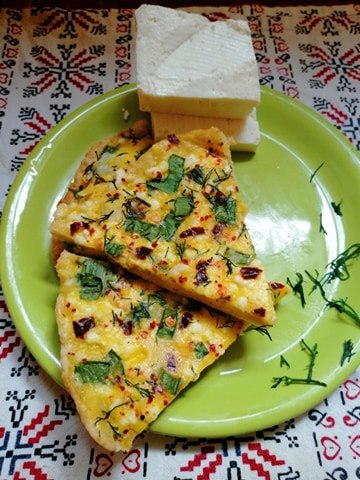Se frământă aluatul din făină, sare, bicarbonat stins cu puțină zeamă de lămâie, ulei și apă. Se întinde cu un sucitor cât să depășească lățimea unei tăvițe rotunde. Se pune în tava tapetată cu hârtie de copt. Se adaugă circular sosul de roșii ca la pizza. Se bat ouăle și se amestecă cu brânza rasă. Se toarnă deasupra. Se adaugă ceapa verde mărunțită, fulgii de chilli/ardeiul iute.