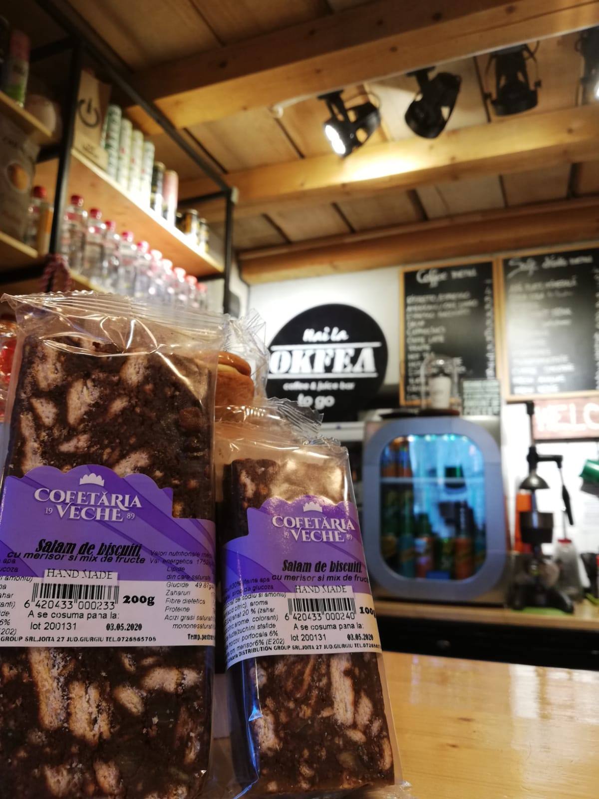 “Deși încercăm să ne îndepărtăm de conceptul de minimarket, în meniu adăugăm constant și alte produse complementare cafelei. Încercăm să mergem pe ideea de cât mai natural și cât mai local, de exemplu un salam de biscuiți tradițional pur românesc, biscuiței de casă, nuga, ciocolată de casă fără zahăr, chipsuri din fructe, batoane de susan și semințe, sărățele de post, bavete, covrigei și saleuri, bere artizanală, chiar și un delicios vin de mure – toate manufacturate local in România și testate de noi în prealabil”, a adăugat David Ioanițescu, co-fondator Okfea.