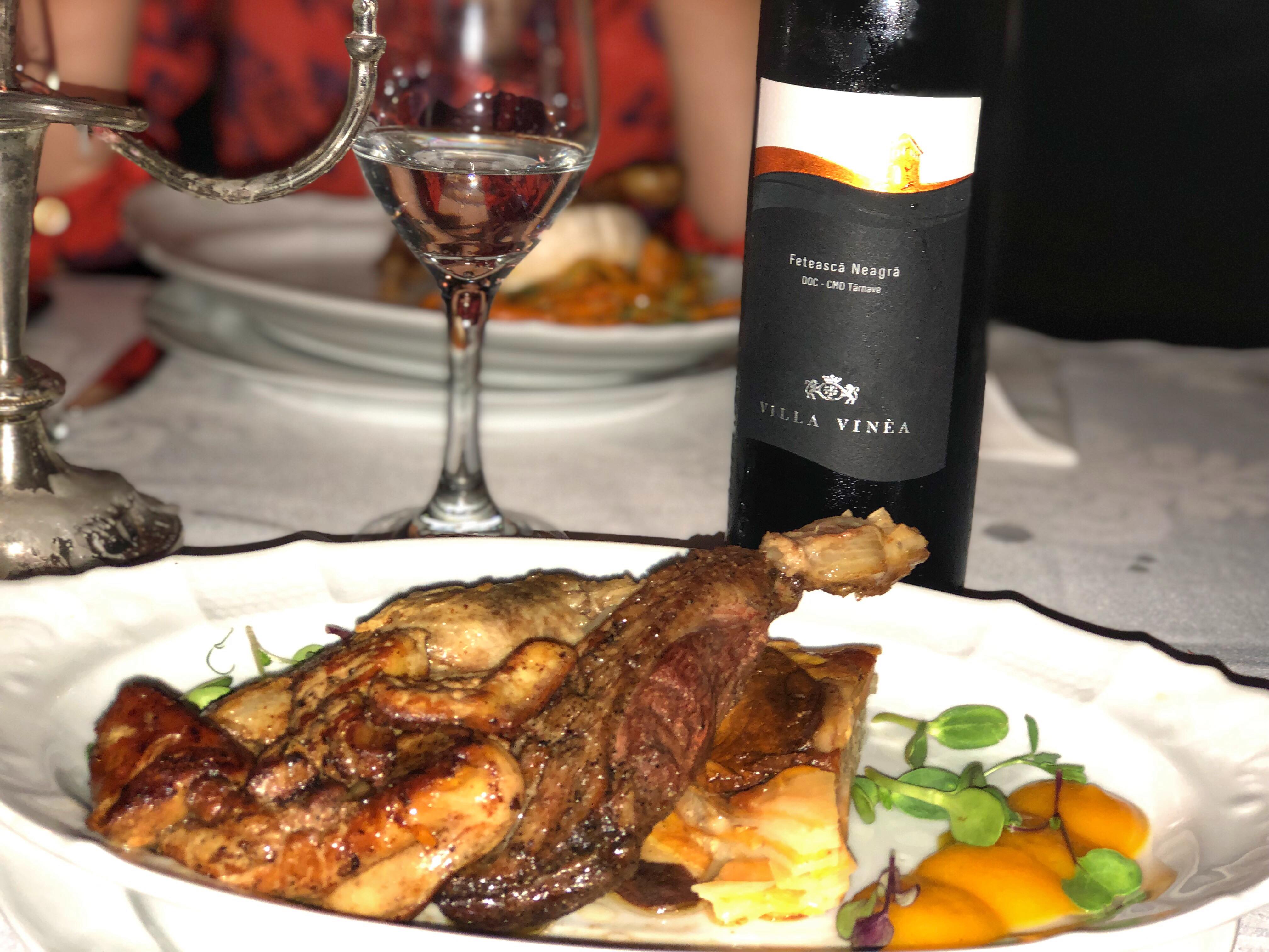 Iar seara, cina a fost savurată în aer liber, în fața castelului Haller, într-un cadru foarte frumos, nobiliar și el, cu sfeșnice, lumânări și gladiole. M-au încântat foie gras-ul pe frigănea de cozonac, foarte bine executat, terina de foie gras, chutney-ul excelent de ceapă, pulpa de rață din trio-ul de rață precum și cartofii Dauphoise savuroși (în condițiile în care eu evit cartofii, am cam mâncat această garnitură). Au fost multe lucruri de savurat efectiv – gustări tot de rață – mezeluri, untură, salam, o salată de vară cu fructe, flori comestibile și Camembert în panko. Ce vă spuneam la început, un adevărat răsfăț, de la care nu ne-am mai fi dat plecați.